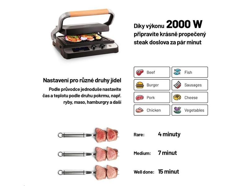 Gril se díky výkonu 2000 W rozehřeje velmi rychle a poradí si i se