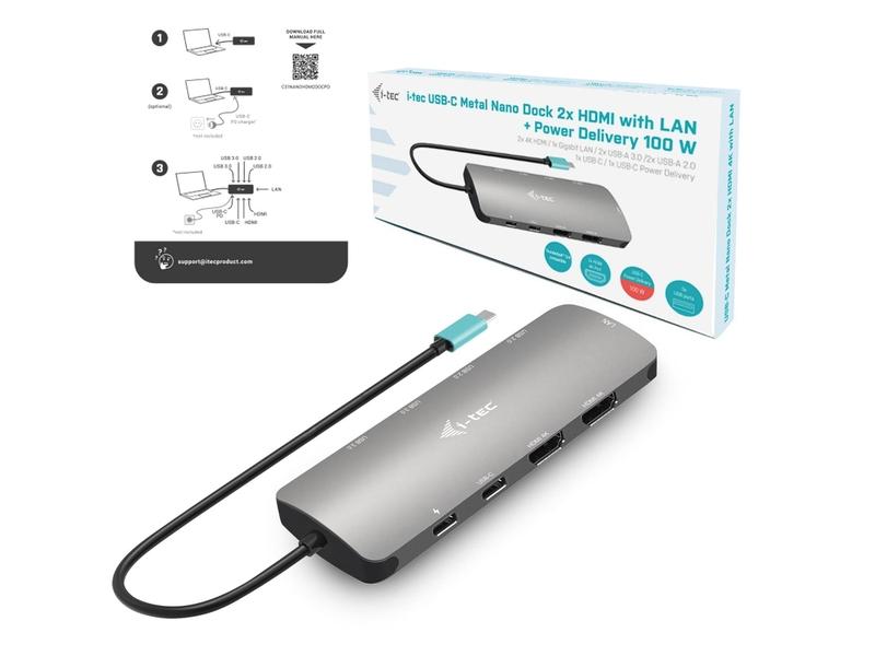 • Malý kovový dok USB-C, ke kterému lze připojit až dva externí monitory.