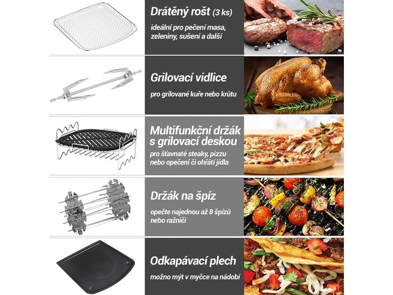 horkovzdušná fritéza, otočný gril, trouba, sušička ovoce