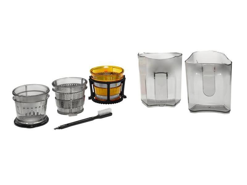 kartáček na čištění sítka, nádoba na šťávu, nádoba na odpad, sítko na