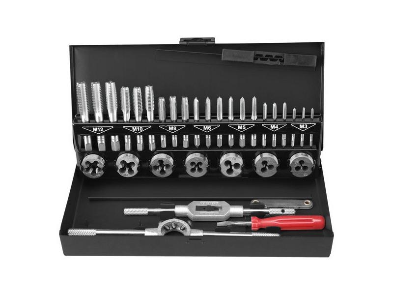 obsahuje 32 závitníků velikostech M3, M4, M5, M6, M8, M10 a M12, vrátidlo,