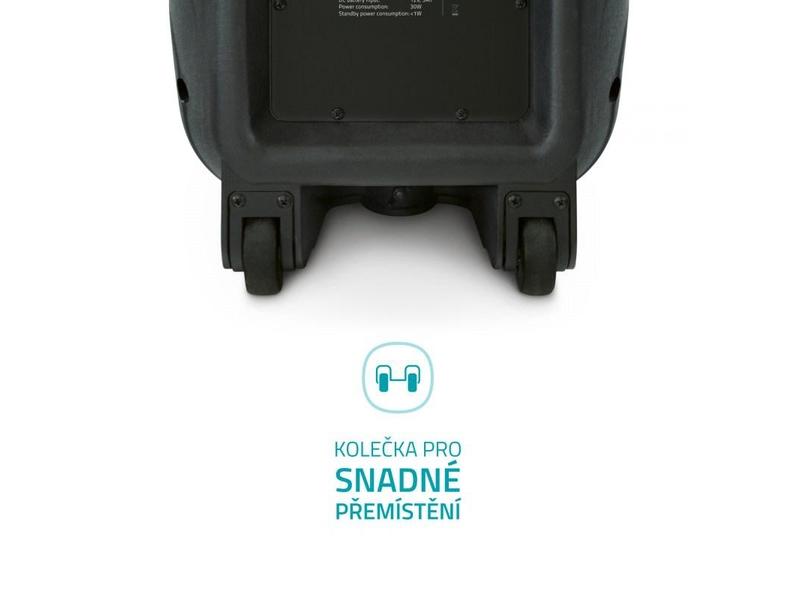 Reproduktor má kolečka a výsuvné madlo, takže přesunout ho z místa