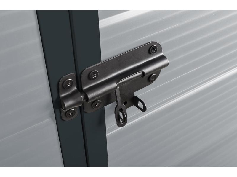 Nad dvoukřídlými dveřmi je umístěna ventilační mřížka, která zajišťuje dostatečné odvětrávání a cirkulaci vzduchu uvnitř domku. Proto se nemusíte bát plísní nebo srážení vody na stěnách v případě náhlých změn teploty.