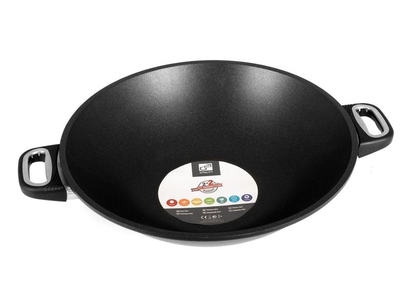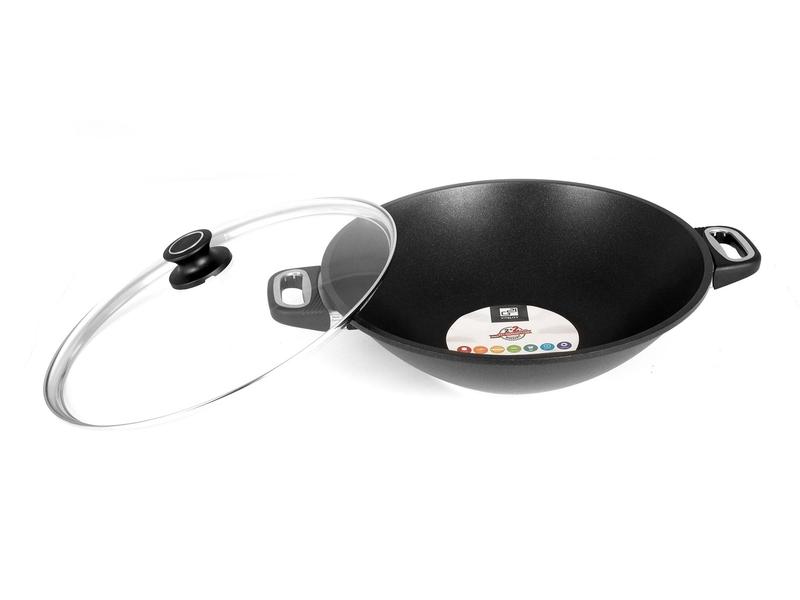 wok pánev o průměru 36 cm, se dvěma madly a poklicí. Pánev